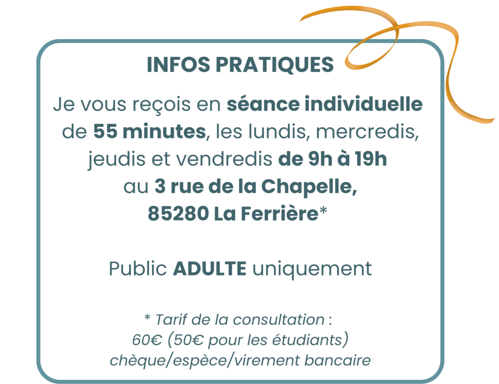 Mon travail consiste à être cette interlocutrice présente, disponible et soutenante. Mes outils de travail sont l’entretien et l’hypnothérapie ; ce sont des pratiques respectueuses des personnes et de leurs besoins. Mais l’atout principal à une bonne psychothérapie c’est vous-même car nous travaillerons ensemble, avec ce que vous êtes, avec ce que je suis.